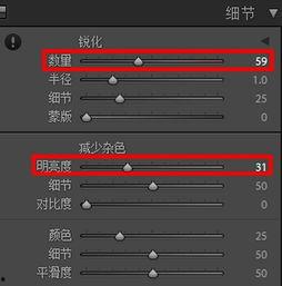 5. 使用细节调整,将锐化程度调低,降噪程度调高。